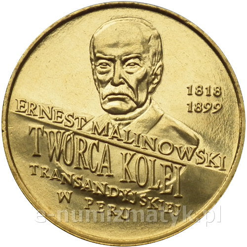 Moneta z serii "Polscy podróżnicy i badacze" - Ernest Malinowski twórca kolei transandyjskiej w Peru 1818-1899. Stan menniczy prosto z woreczka.