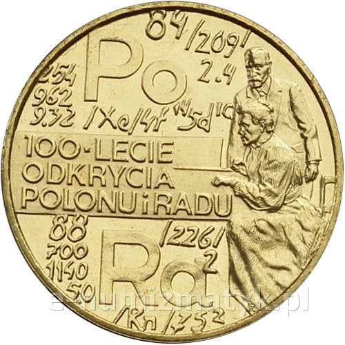 Na rewersie: sylwetki Marii Skłodowskiej-Curie i Piotra Curie na tle symboli z układu okresowego pierwiastków. Stan menniczy prosto z woreczka.