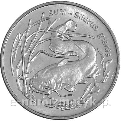 Rewers: wizerunek suma wśród wodnej roślinności, u góry półkolem napis: SUM - Silurus glanis.